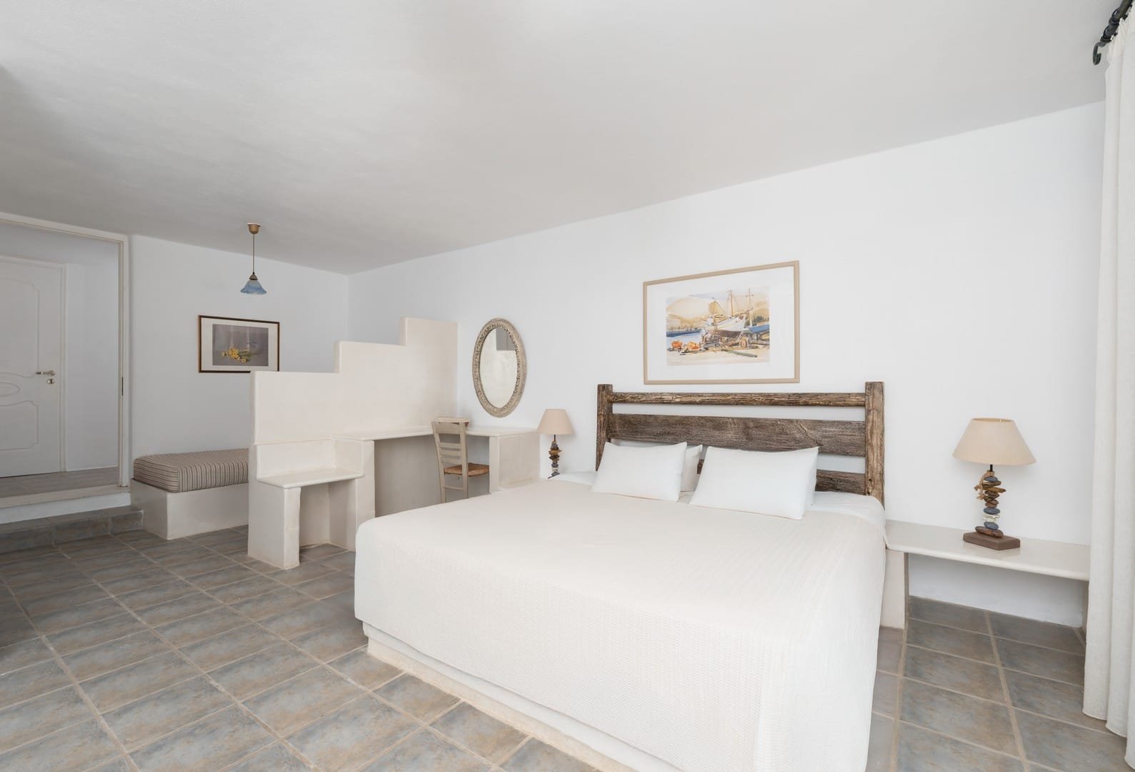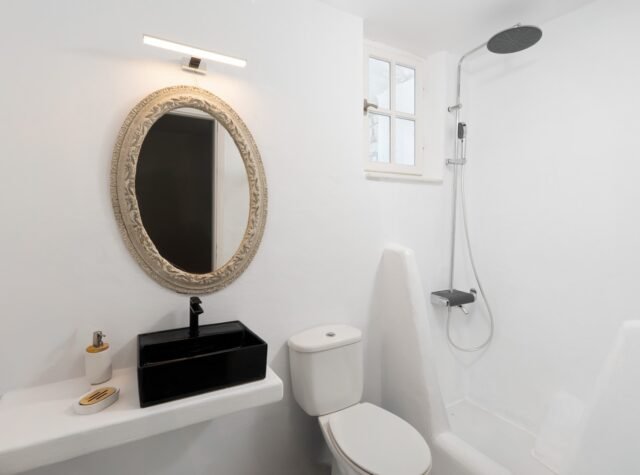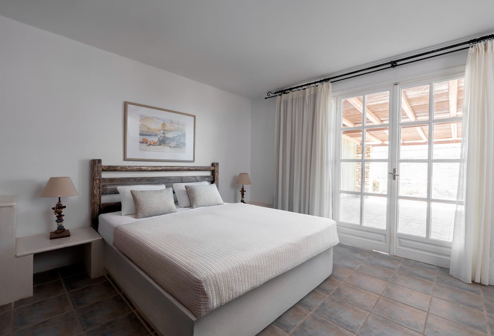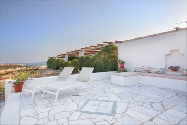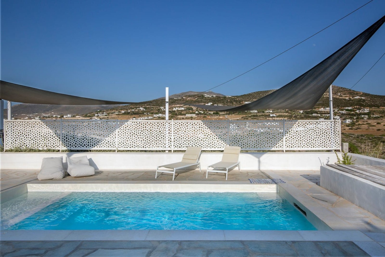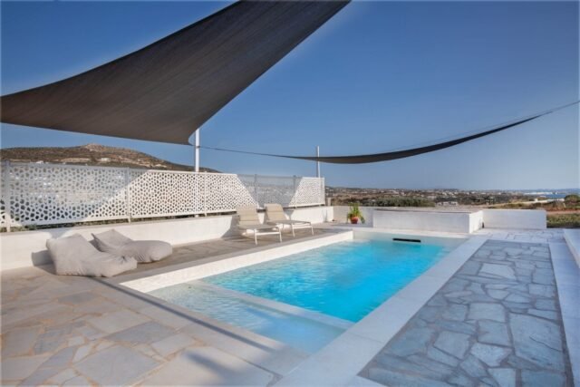 The villa has its own pool with comfortable deck chairs and a stunning view to the Aegean Sea. It is a private, secluded spot, ideal for complete relaxation.